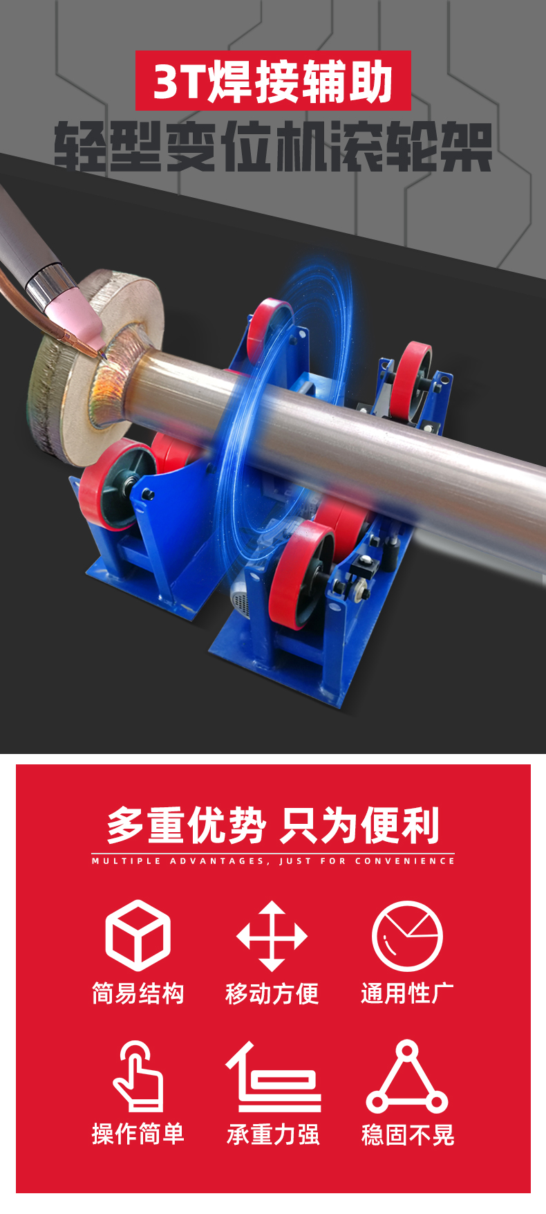 鑫浩3噸焊接滾輪架具有結(jié)構(gòu)簡單、移動方便、通用性廣的特點(diǎn),